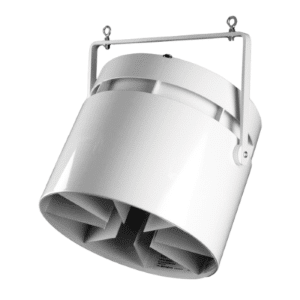 Het ONYX-model uit de STANDARD-serie heeft een dubbele aanzuiging en kan geïnstalleerd worden aan plafonds van maximaal 13 meter hoog.